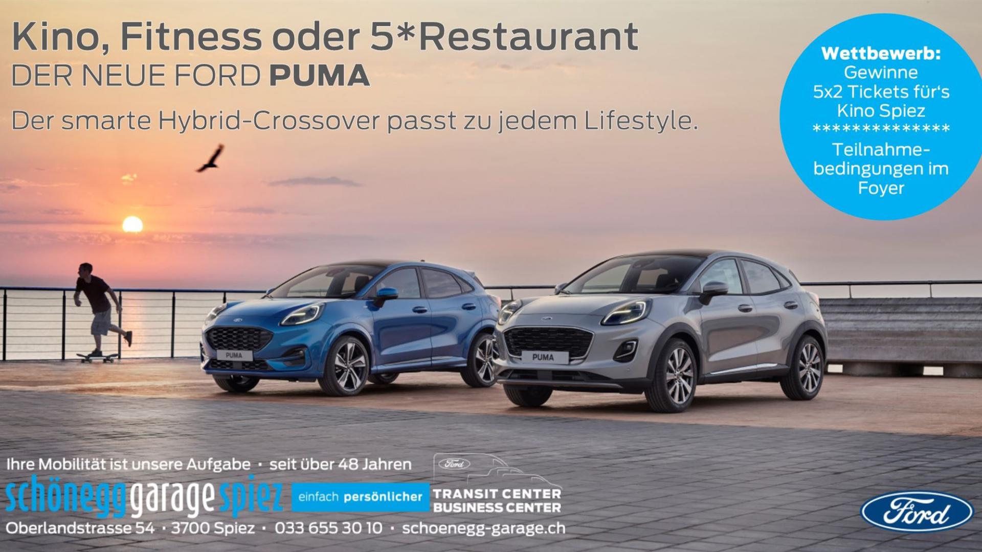 Mache ein Selfie von Dir und/oder Deinen Freunden vor dem neuen Ford Puma. Es kann der Puma im Kino sein oder ein Fahrzeug, das bei uns vor oder in der Ausstellung steht. Poste dieses Bild in Facebook mit @schoeneggGarageAG. Es können auch mehrere Bilder eingesandt werden. Wir freuen uns auf Eure zahlreichen Einsendungen. Die Gewinner werden per PN benachrichtigt. Viel Glück!